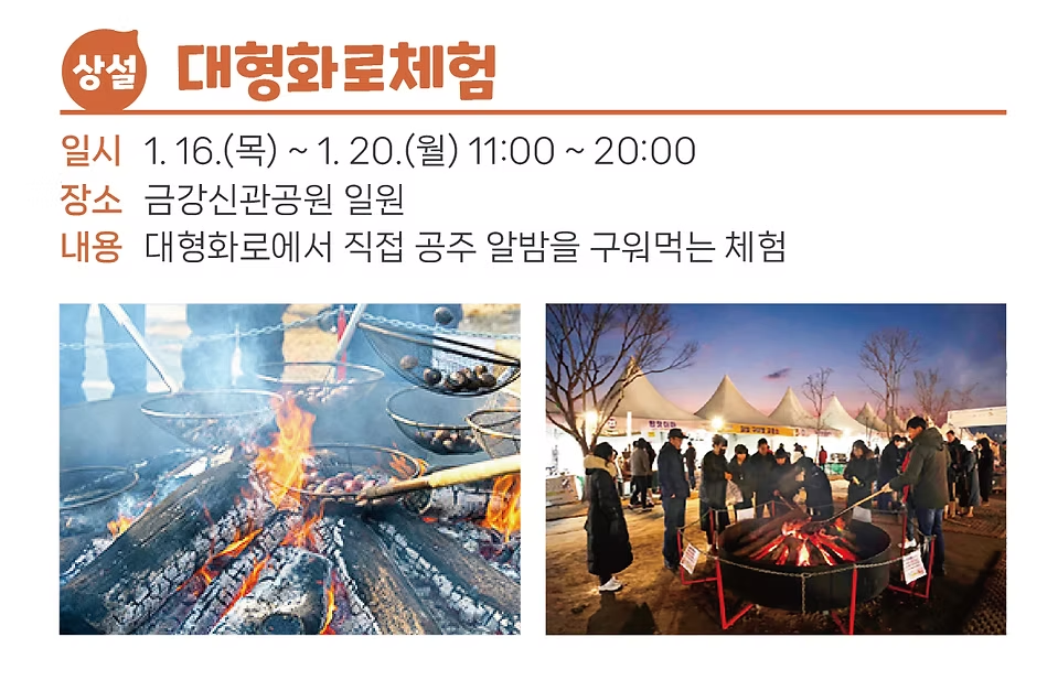 - 대형 화로 체험: 직접 군밤을 구워보며 따뜻한 화로의 온기를 느껴보세요.