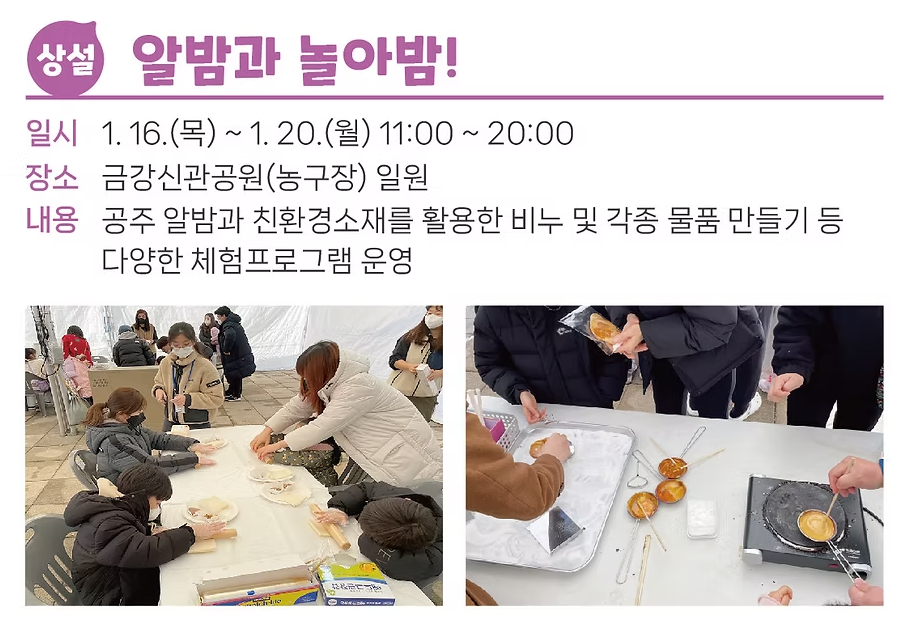 - 알밤과 놀아밤: 밤을 활용해 공예품을 만들며 창의력을 발휘하세요.