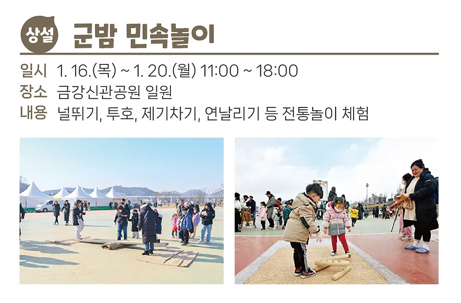 - 군밤 민속놀이: 투호, 제기차기 등 남녀노소 모두 즐길 수 있는 민속놀이
