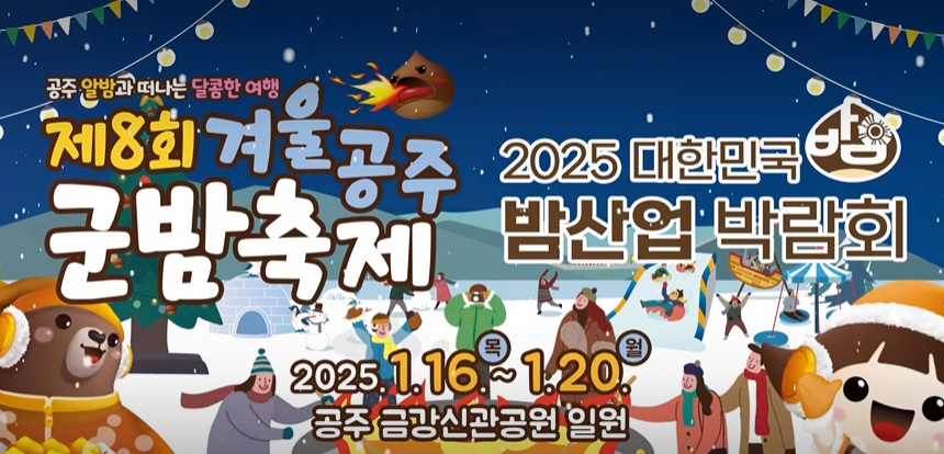 겨울공주 군밤축제는 충청남도 공주의 대표적인 겨울 축제로, 지역 특산물인 공주 알밤을 테마로 한 다양한 프로그램이 열립니다. 밤의 고소한 향과 따뜻한 겨울의 감성을 느끼며 추억을 쌓을 수 있는 특별한 축제입니다. 특히 올해는 더욱 다채로운 체험 프로그램과 이벤트가 준비되어 있으니 기대해도 좋습니다.