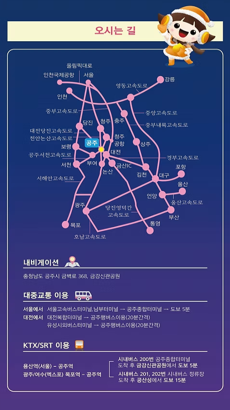 - 대중교통: 공주역에서 버스로 약 15분 거리