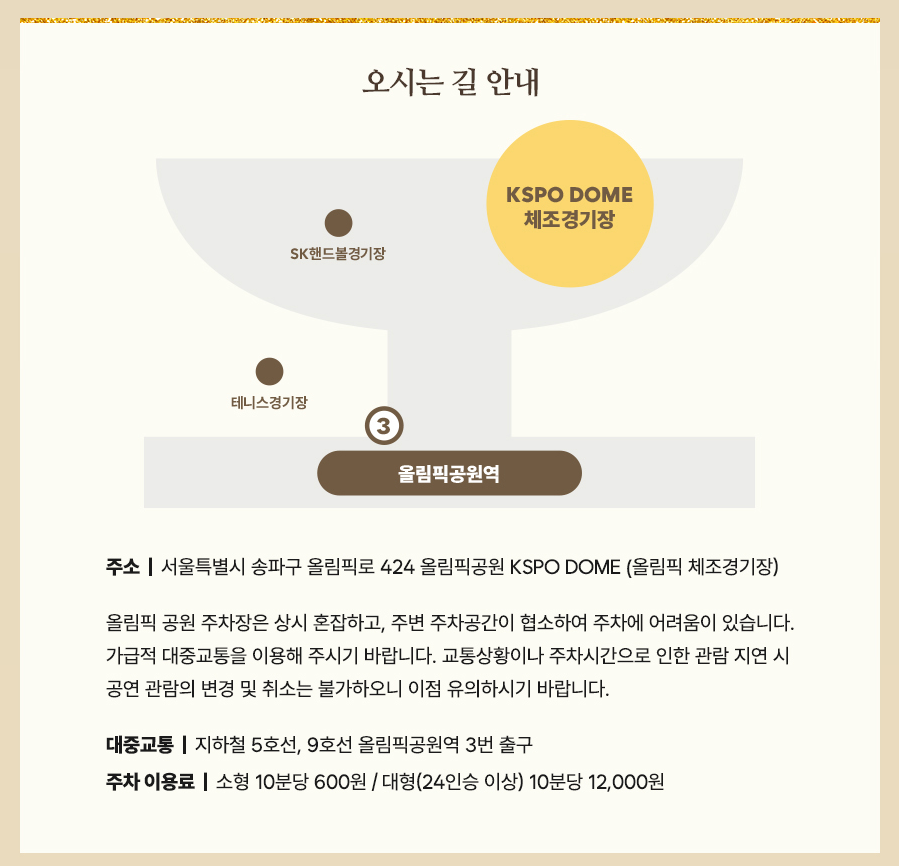 - 주소: 서울특별시 송파쿠 올림픽로 424 (올림픽 체조경기장)
