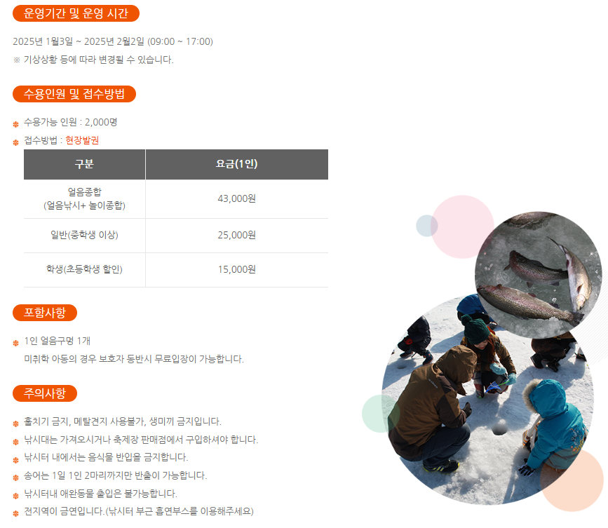 - 텐트낚시: 따뜻한 텐트 안에서 송어를 낚는 특별한 경험을 즐겨보세요. 추운 날씨에도 안락하게 낚시를 할 수 있어 인기 만점!